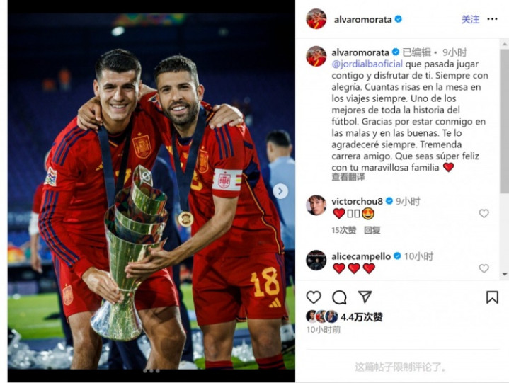 直播吧10月8日讯阿尔巴布告将在本赛季截止后退役,曾在西班牙队与他同事的莫拉塔社媒发文请安。