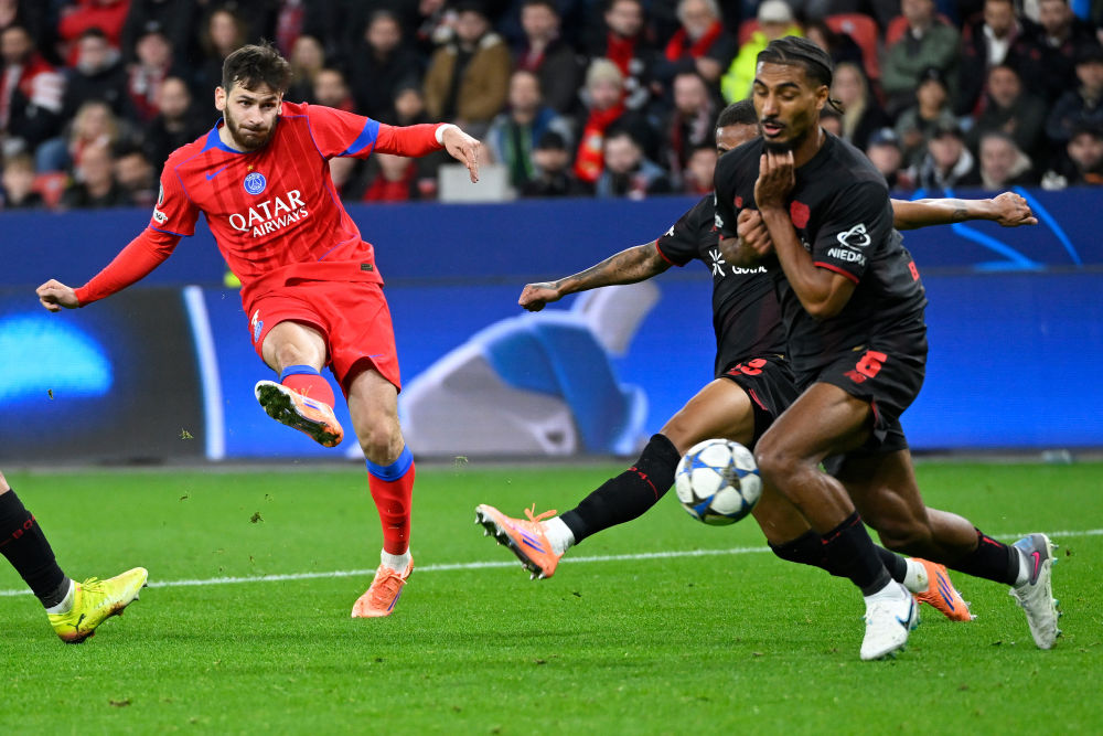 10月21日,巴黎圣日耳曼队球员克瓦拉茨赫利亚(左一)在与勒沃库森的欧冠比赛中射门得分。新华社发(乌尔里希·胡夫纳格尔摄)