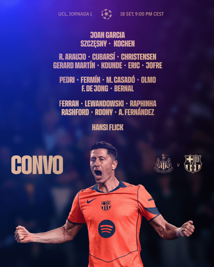 虎扑09月17日讯北京技艺9月19日凌晨3时,2025-26赛季欧冠联赛阶段第1轮,巴塞罗那作客圣詹姆斯公园球场挑战纽卡斯尔联。赛前巴萨公布了本场比赛的大名单。